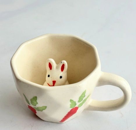 Start your day with a delightful surprise! This playful mug features a charming rabbit hidden inside, making every sip a little more magical. Whether you 're pinning ideas or simply enjoying a quiet moment, this quirky animal mug adds a touch of whimsy to your daily routine. Perfect for animal lovers and anyone who enjoys a bit of fun with their coffee or tea. Designed for comfort and crafted with intricate details, this mug not only feels great in your hand but also elevates your beverage experience with its unique charm. Product Details: • Material: High-quality ceramic • Finish: Smooth, glazed with handmade detailing • Capacity: 280 ml • Height: 4 inches • Diameter: 3 inches • Handcrafted in India Care Instructions: • Microwave, dishwasher & food safe • Avoid steel wool or harsh scrubbing • Handle with care – may chip or break on impact • Prolonged staining may lead to discoloration Product note At Rare Livin , each piece is a one-of-a-kind creation, thoughtfully handcrafted by skilled artisans. Because of the handmade nature of our products, you may notice slight variations in color, texture, size, or shape. These subtle differences are not flaws—they are marks of authenticity that celebrate the artistry behind every item. Please note: We take great care in packaging your order, using protective bubble wrap and a sturdy shipping box to ensure it arrives safely. Gift boxes and gift wrapping are available for an additional charge and can be selected at checkout.